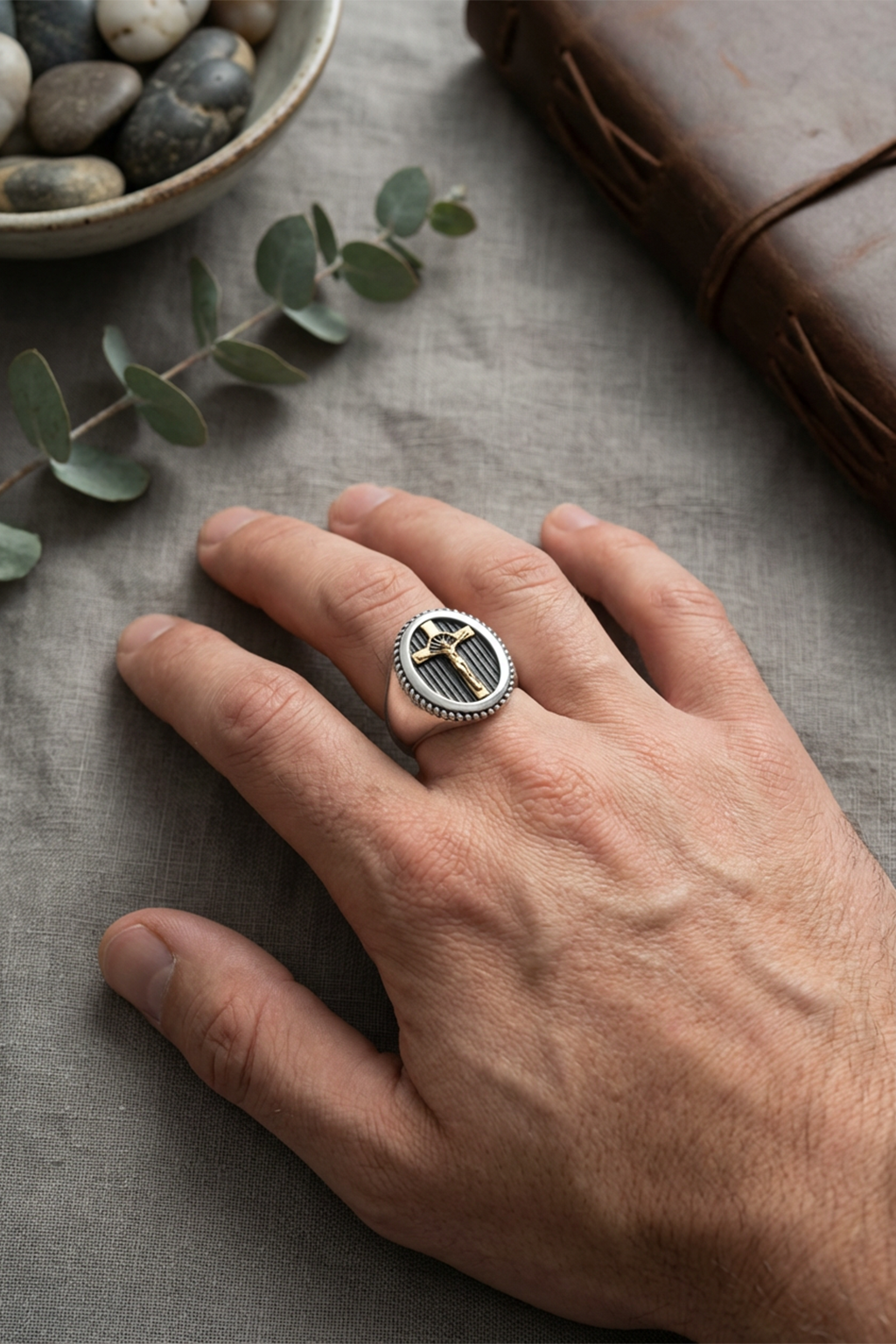 PORTA CON TE QUESTO ANELLO CON SIGILLO DA UOMO DECORATO CON UN CROCIFISSO E INDOSSA LA TUA FEDE COME UN CRISTIANO DEVOTO.