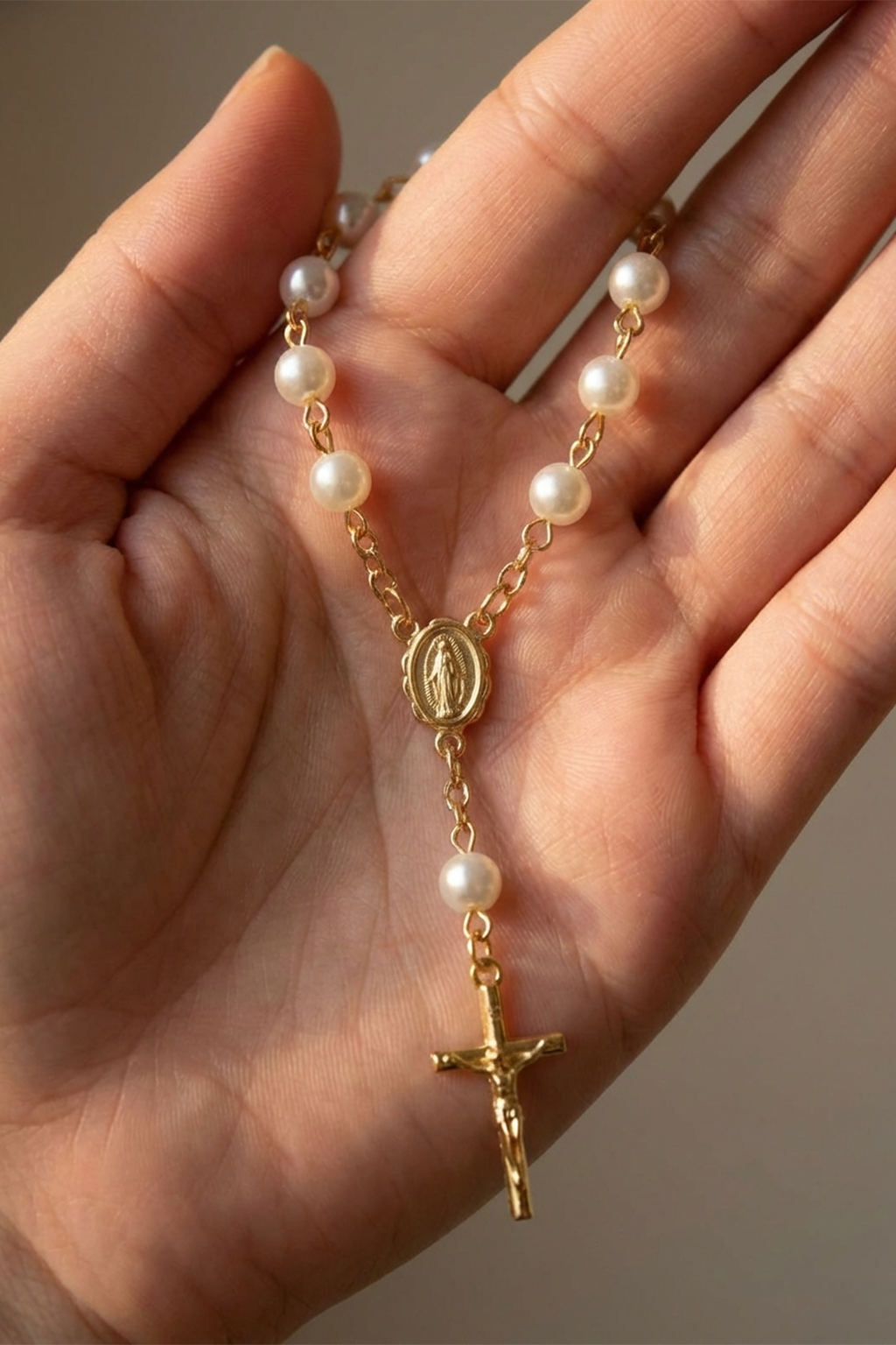 Cada conta de madrepérola, cuidadosamente escolhida, é um lembrete da beleza da criação divina. A cruz cristã em ouro, finamente trabalhada, é um símbolo forte da fé católica e da sua devoção.